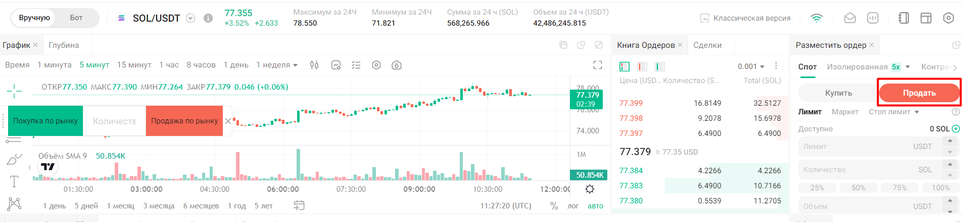Осталось продать USDT за Solana. Проверить поступление SOL можно в разделе «активы»