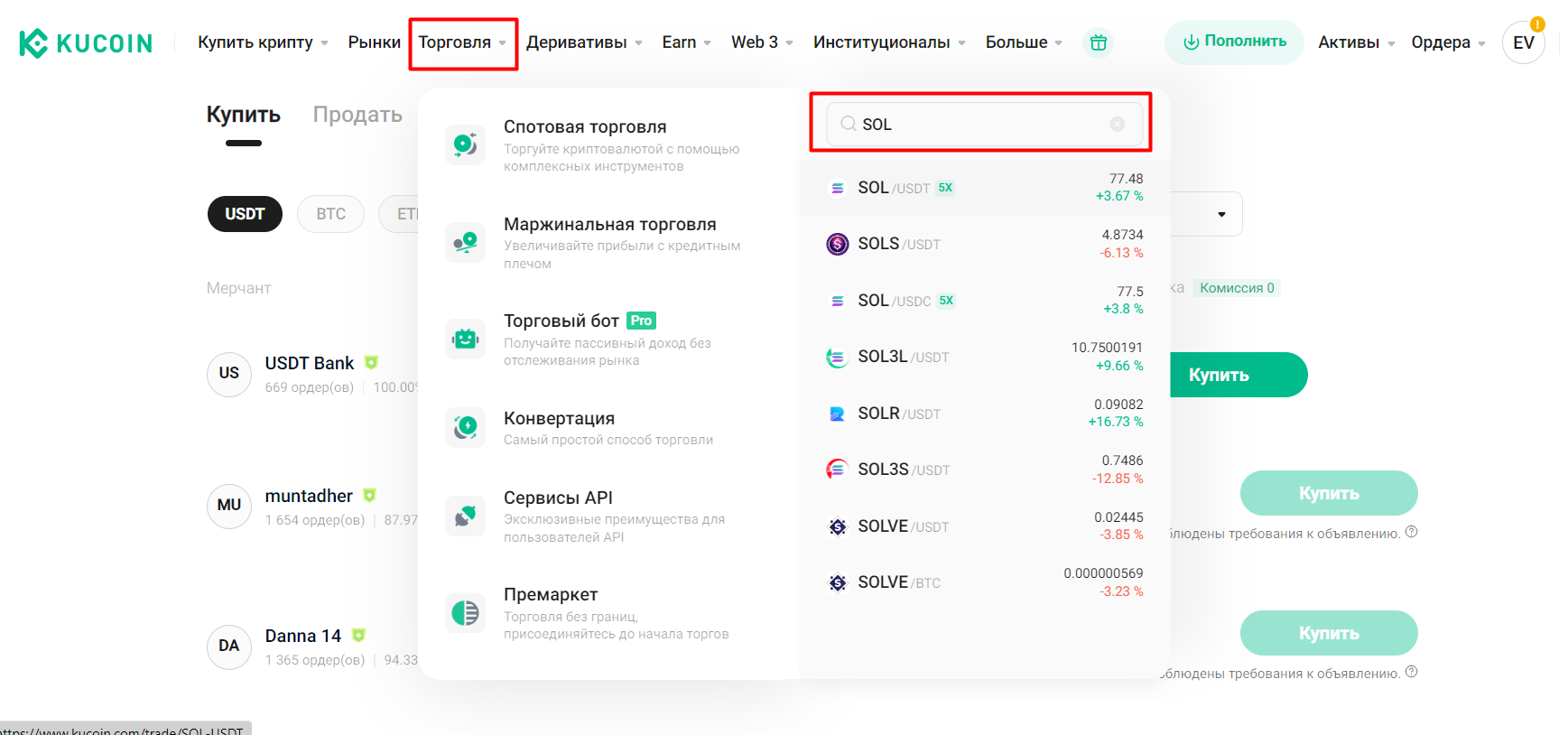 Чтобы купить Solana на KuCoin, перейдите в раздел P2P.