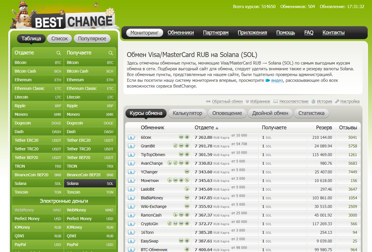 Подобрать обменник, в стенах которого можно купить Solana, можно, например, при помощи агрегатора BestChange. Для этого в основном меню нужно указать интересующую криптовалюту и способ оплаты.
