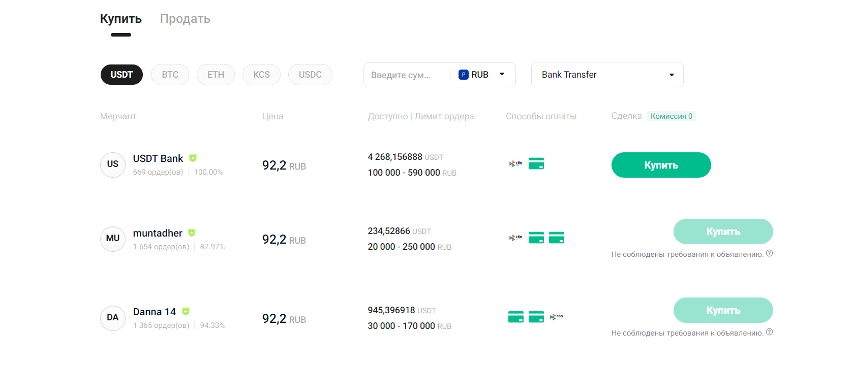 P2P-платформа KuCoin поддерживает пять криптовалют: стейблкоины USDT и USDC, а также биткоин, Ethereum и нативный токен криптобиржи KCS. Сначала потребуется купить одну из доступных монет. На скрине ниже выбран долларовый стейблкоин USDT, а в качестве способа оплаты указан банковский перевод. Вы можете выбрать другую монету и удобный вариант расчета. Биржа выдаст доступные варианты. Из них нужно выбрать подходящий и нажать на клавишу «купить».