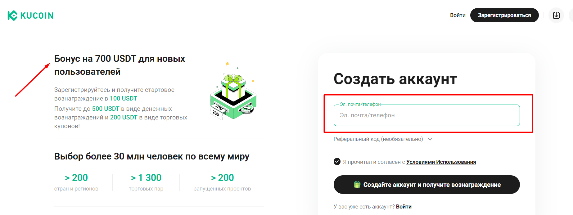 Биржа предложит зарегистрировать аккаунт на адрес почты или телефон. После ввода e-mail или номера мобильного нажмите «создать аккаунт». Также обратите внимание на бонусы, которые Kucoin предлагает новичкам. Информация о них будет на странице регистрации слева.