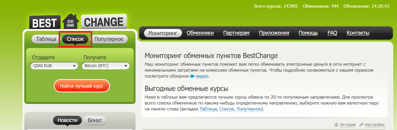 Обменник — площадка, на которой можно купить криптовалюту за фиат и другие активы. Найти подходящее предложение можно на популярном сервисе для мониторинга обменных пунктов — BestChange. В разделе «список» нужно выбрать способ оплаты и криптовалюту для покупки. Система предложит самые выгодные, на момент поиска, варианты.