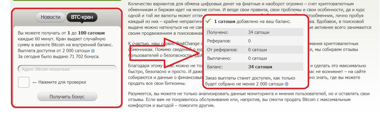 На русскоязычной платформе BestChange есть биткоин-кран, который позволяет получить биткоин в подарок. Платформа выдает от 1 до 100 сатоши каждые 60 минут. Чтобы получить монеты, достаточно ввести капчу и адрес криптокошелька.