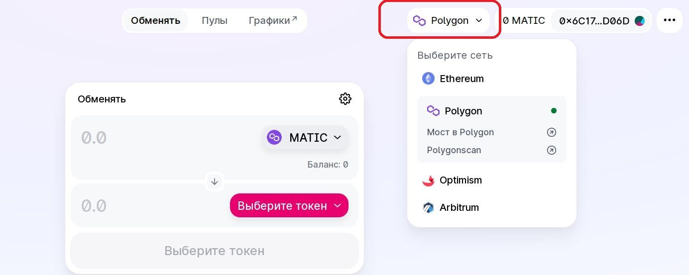 - Polygon. Для начала работы потребуется одна из криптовалют: MATIC, WETH, USDC, DAI, USDT, WBTC.