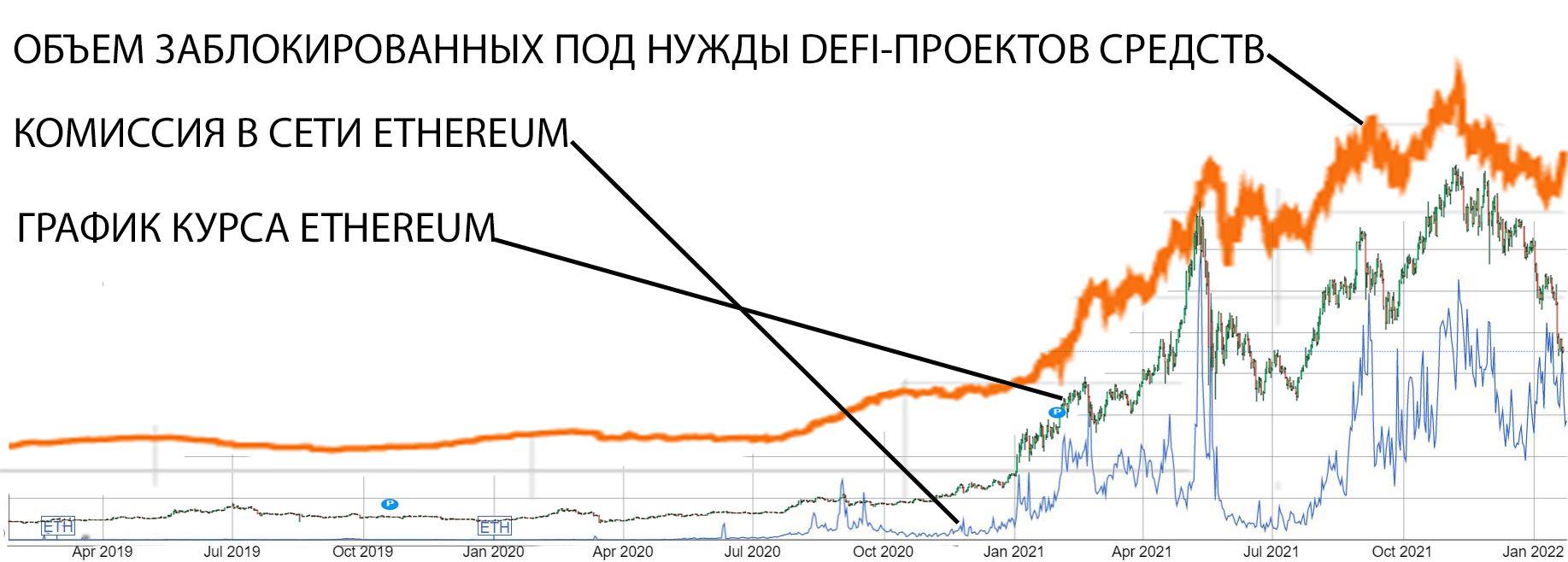 Анализ графиков указывает на высокую корреляцию стоимости транзакций в сети криптовалюты с движением курса ETH и интереса инвесторов к DeFi-сегменту рынка.