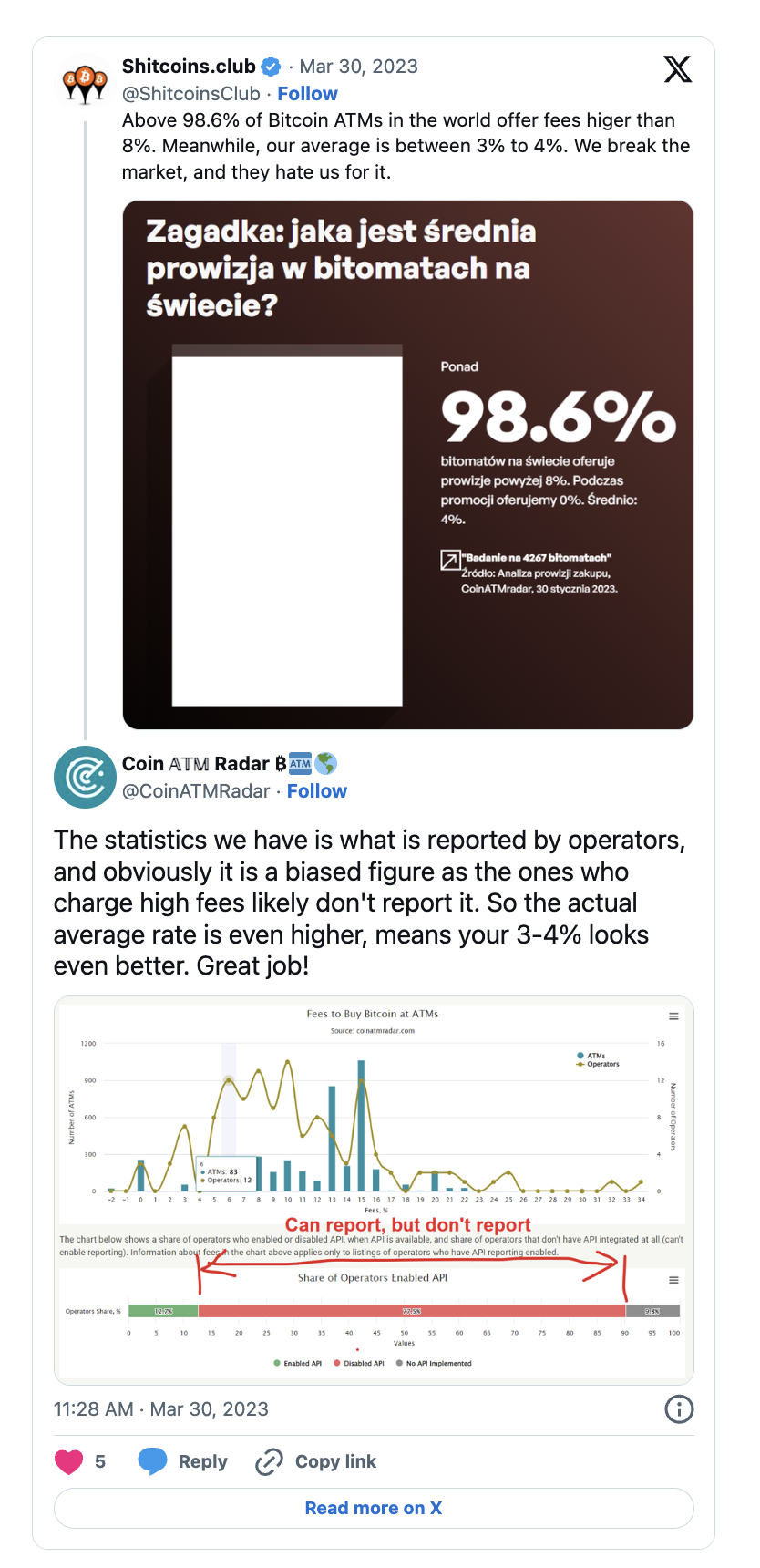 В отличие от традиционных банкоматов, биткоин-банкоматы обычно взимают комиссию в процентах от суммы транзакции. Согласно Coin ATM Radar, эти комиссии составляют около 8-15% или выше. Однако некоторые банкоматы, такие как Bitomat, могут взимать комиссию около 3-4%.