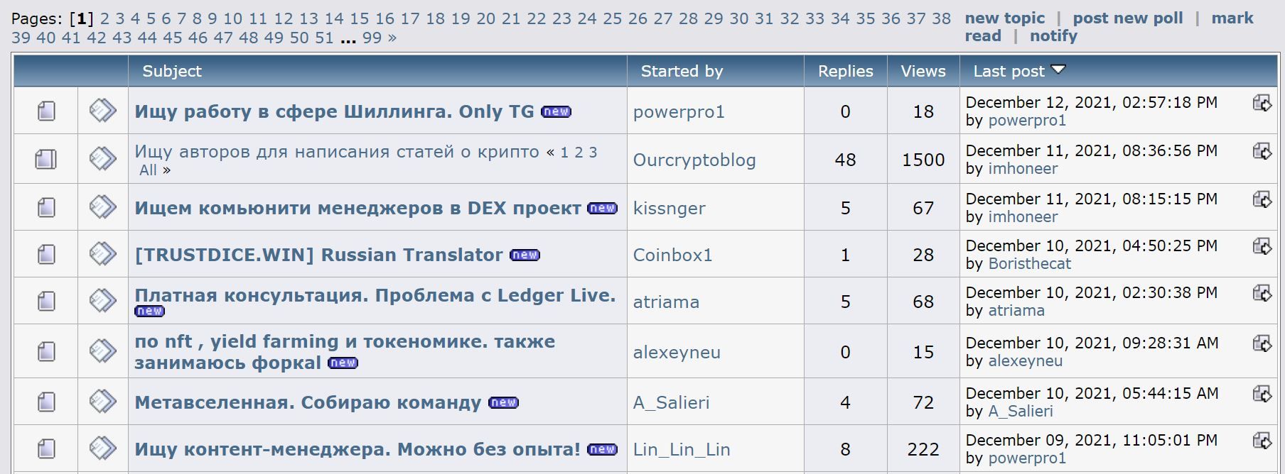 - Тематические форумы. В том числе, соискателю стоит обратить внимание на раздел «работа» платформы bitcointalk.