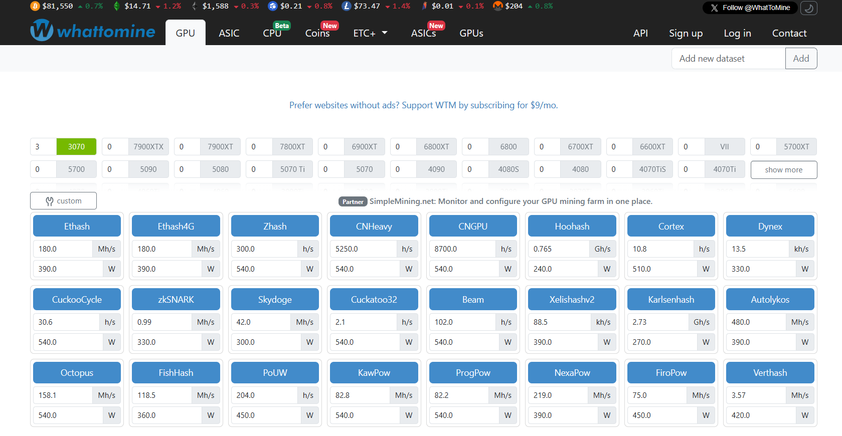 Один из самых известных калькуляторов майнинга, особенно среди тех, чей основной заработок – майнинг на видеокартах. Сервис WhatToMine позволяет выбрать модели GPU (или ввести суммарный хешрейт и потребление) и показывает, какие криптовалюты сейчас самые прибыльные для добычи. Он учитывает текущую сложность сети, награду за блок и цену каждой монеты, выводя ожидаемый доход в сутки или месяц.