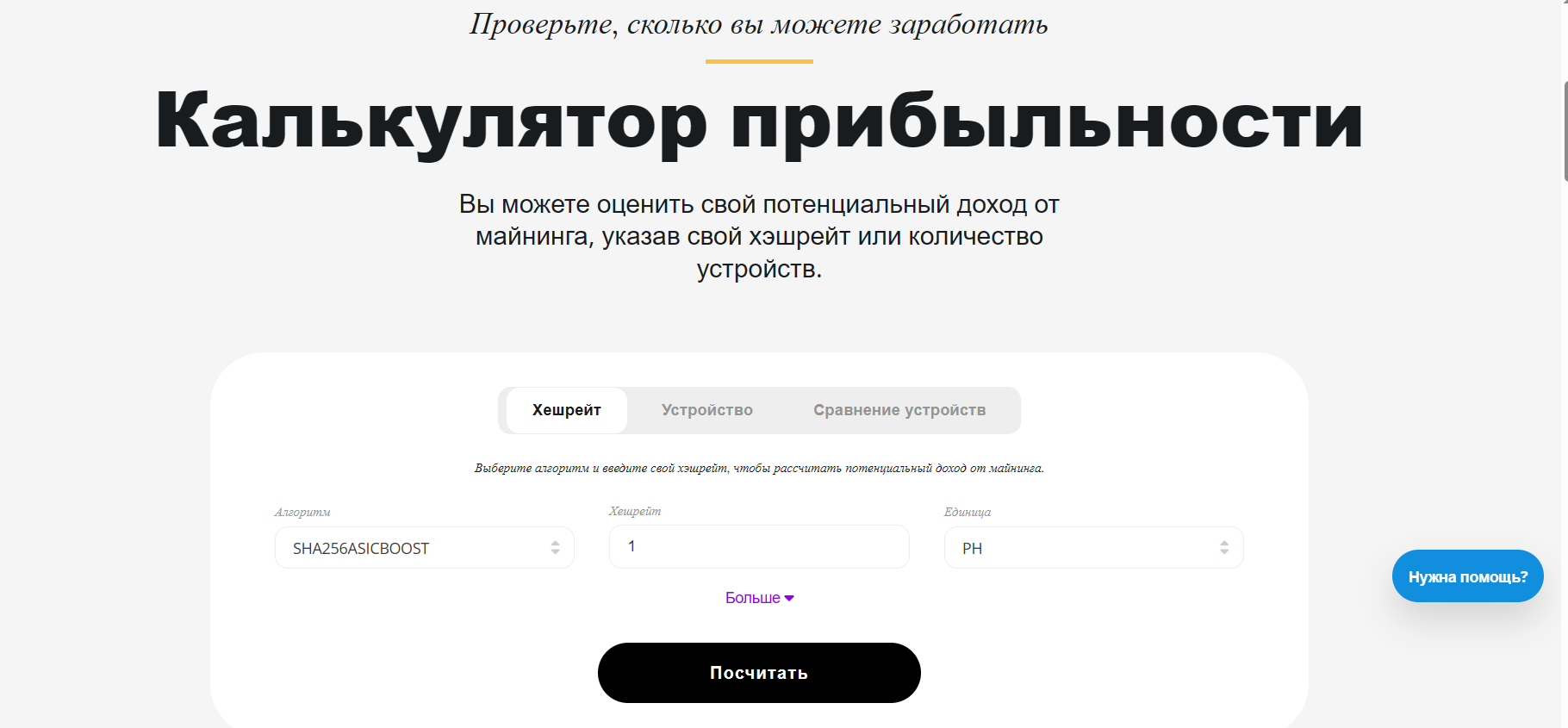 Для биткоина чаще всего применяют ASIC-калькуляторы на WhatToMine или CryptoCompare. Они позволяют выбирать конкретную модель майнера, указывать энергопотребление и тариф, чтобы рассчитывать доходность именно по биткоину (SHA-256)