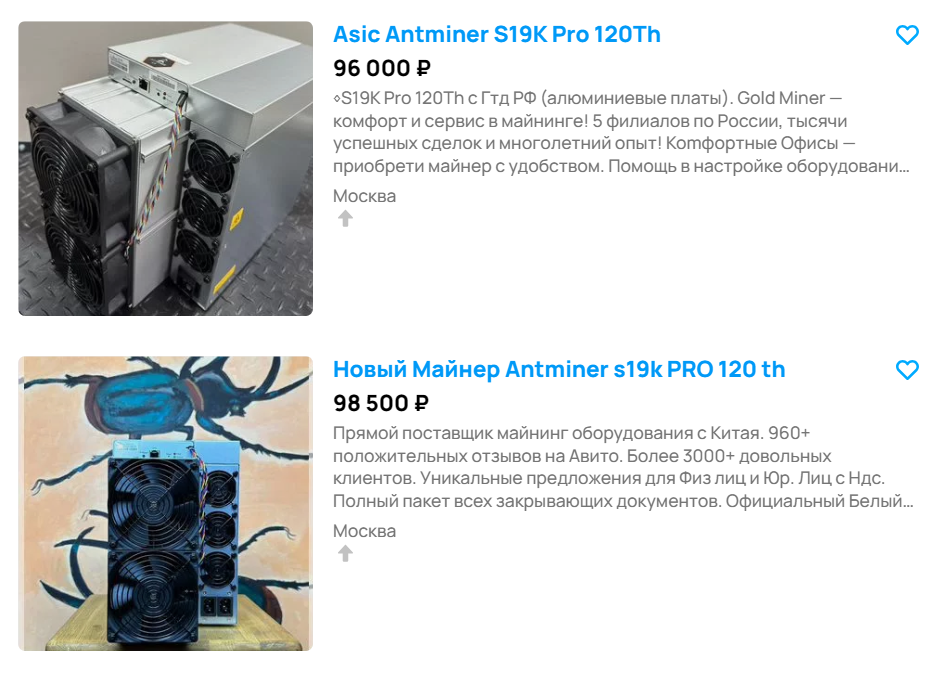 Популярностью в РФ пользуется Bitmain Antminer S19K Pro с потреблением 2,8 кВт·ч. Майнеры чаще всего покупают модели на 120 TH/s. Приобрести такую машину на Авито сегодня можно по цене от 90 000 рублей.