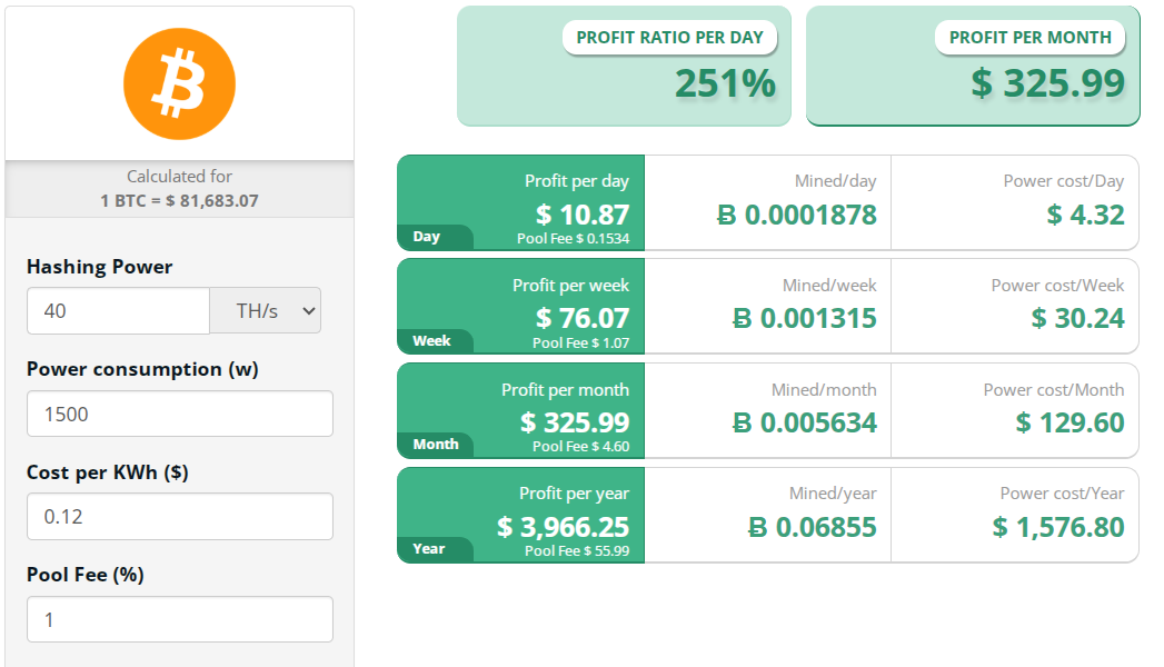 После расчета вы получите результат, например: устройство генерирует ~0,0002 BTC в сутки (при текущем курсе это около $6), а затраты на электроэнергию составляют $3, значит чистая прибыль ~$3 в день.