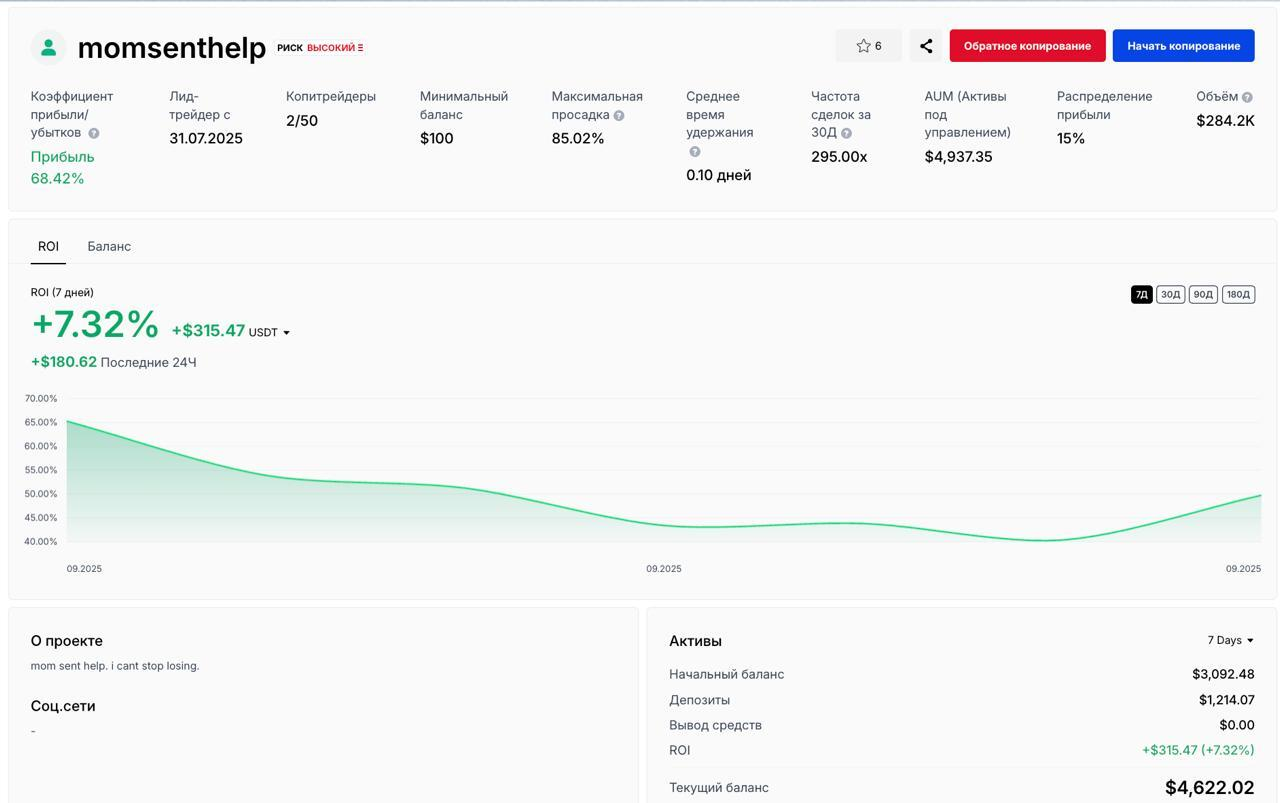 - Простое подключение: достаточно выбрать трейдера, указать сумму и задать параметры риска.