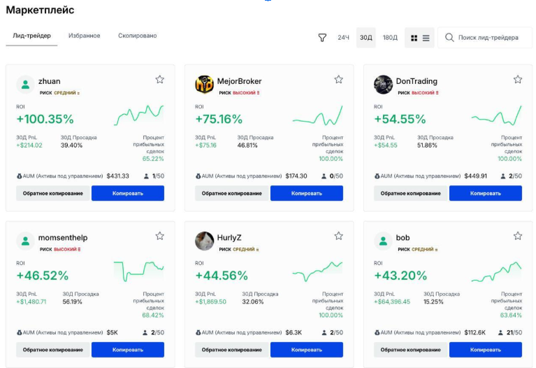 В разделе копитрейдинг вы можете фильтровать лид-трейдеров по различным показателям, таким как число копитрейдеров, уровень риска, PnL, активы аккаунта, процент прибыльных сделок и другим параметрам, чтобы найти трейдеров, которые соответствуют вашим целям.
