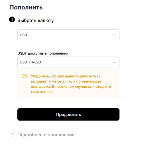 В разделе Активы выберите Пополнить, выберите криптовалюту для перевода и сеть.
