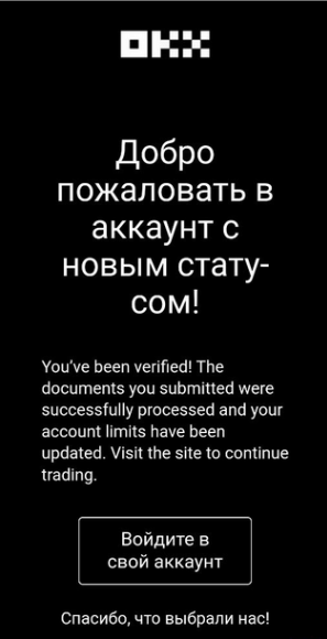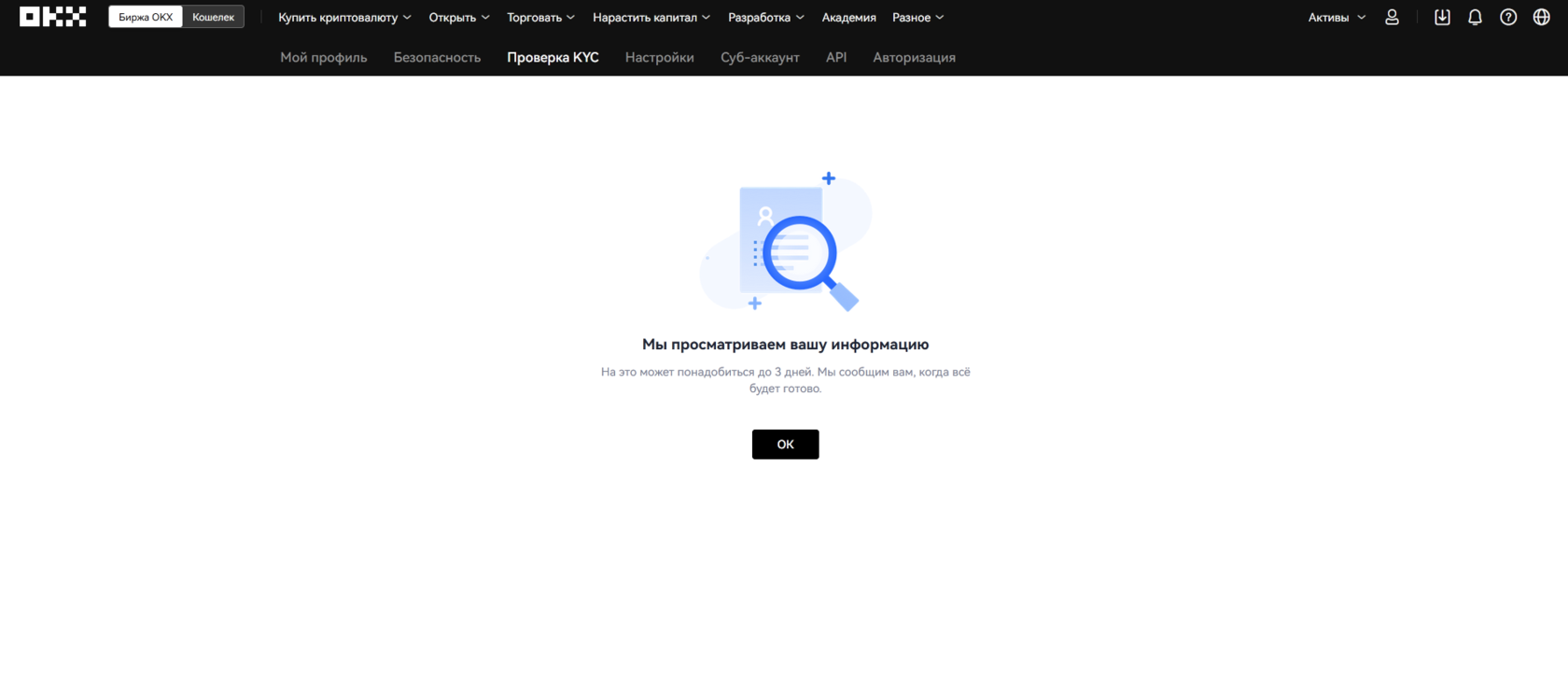 Пополнить аккаунт OKX криптовалютным переводом можно после прохождения первого уровня верификации KYC на бирже.