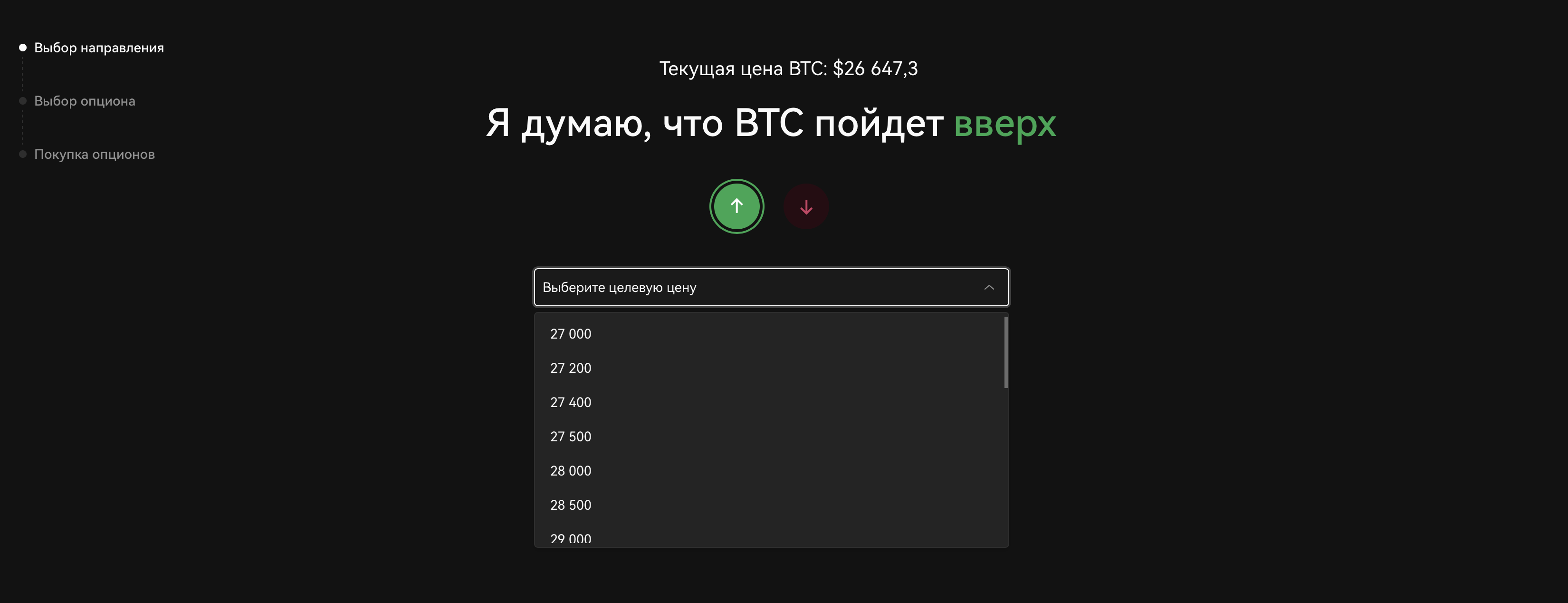 Опционы на OKX представлены в двух форматах — простом и профессиональном. Простые опционы оформлены в упрощенном интерфейсе. Пользователю предлагается выбрать направление движения BTC или ETH относительно целевой цены — вверх или вниз (колл/пут), а затем указать дату экспирации опциона. Если к моменту экспирации цена соответствует «ставке» трейдера, он получает прибыль. Если нет — теряет деньги.