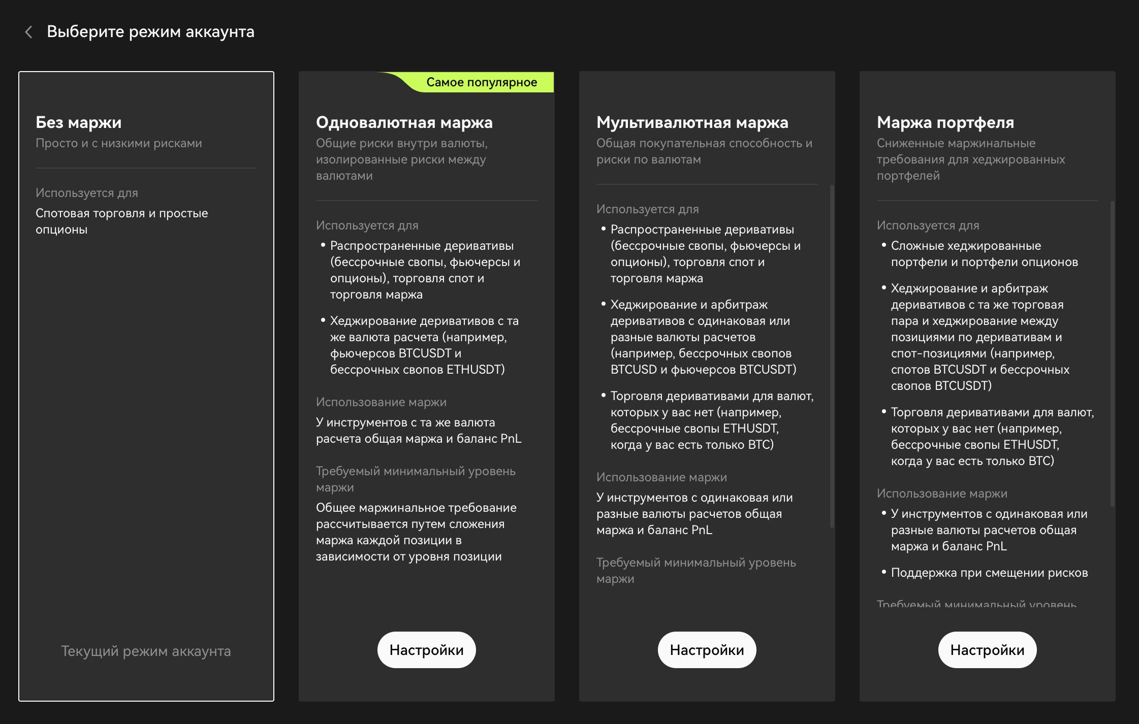 Всего на OKX доступны четыре типа аккаунтов — «Простой», «Одновалютная маржа», «Мультивалютная маржа» и «Маржа портфеля». По умолчанию установлен первый.
