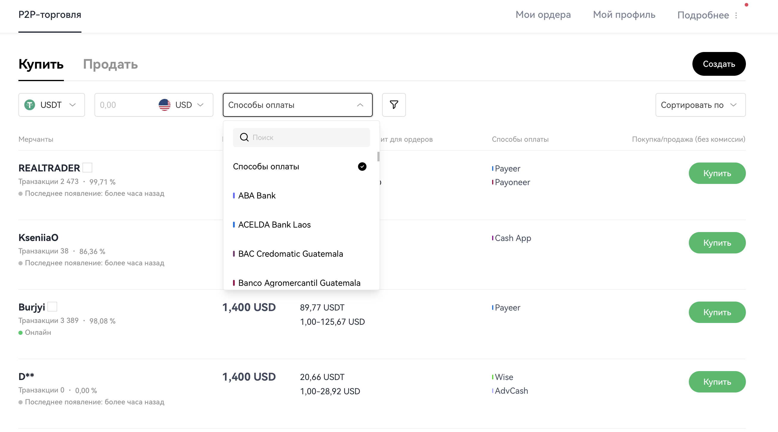 Чтобы купить цифровые активы на одноранговой платформе P2P, нужно перейти на вкладку P2P-торговля в разделе Купить криптовалюту.