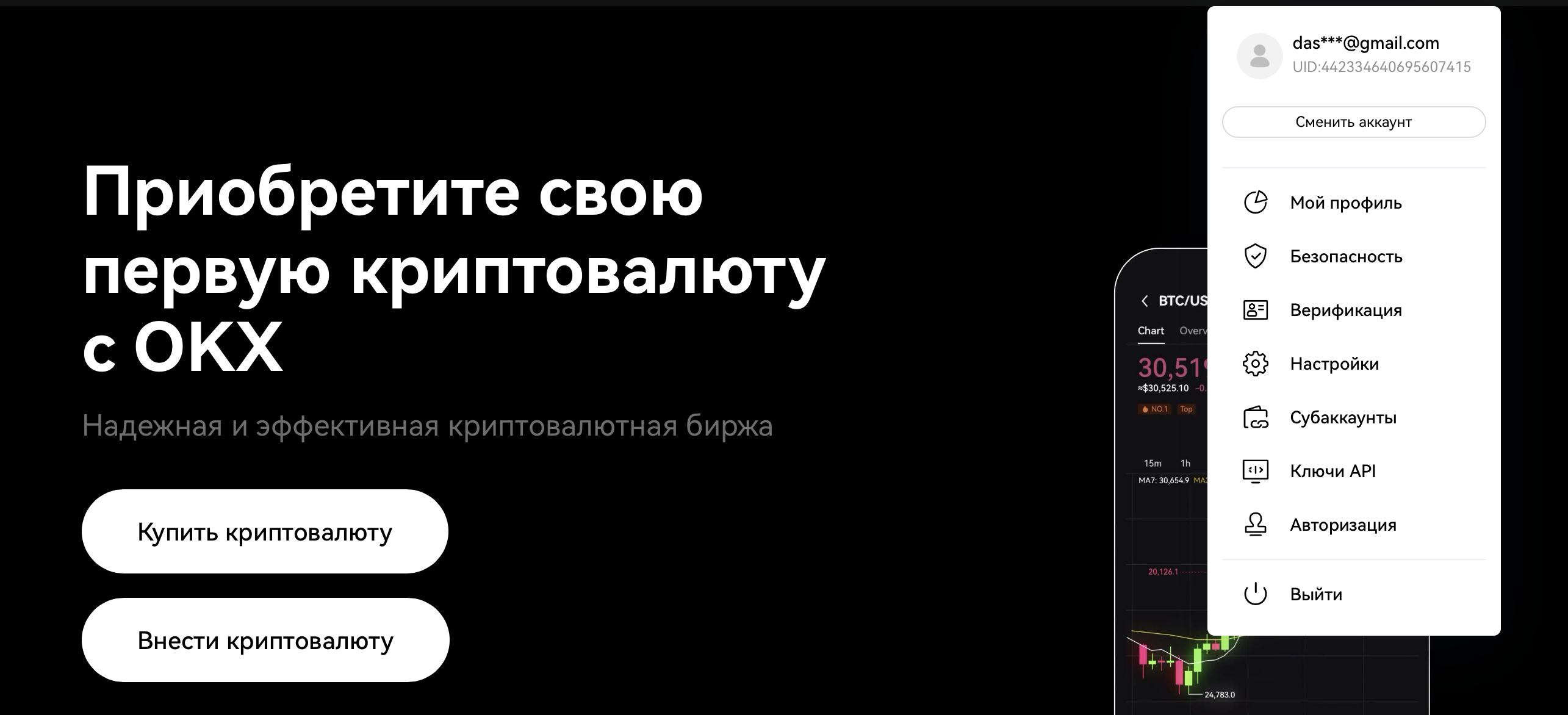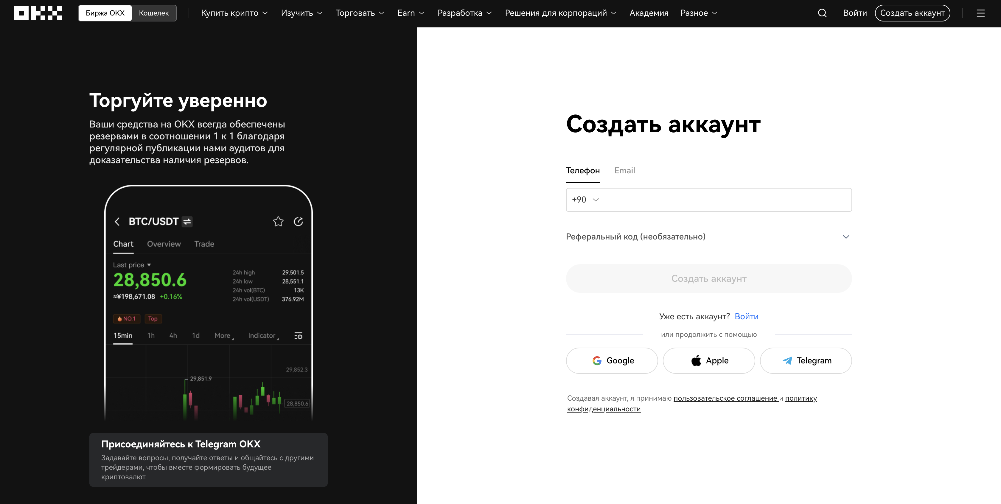 Торговать на OKX можно только после регистрации. Для открытия счета понадобится электронный адрес или номер телефона. Также доступна регистрация через аккаунт Google или мессенджер Телеграм.