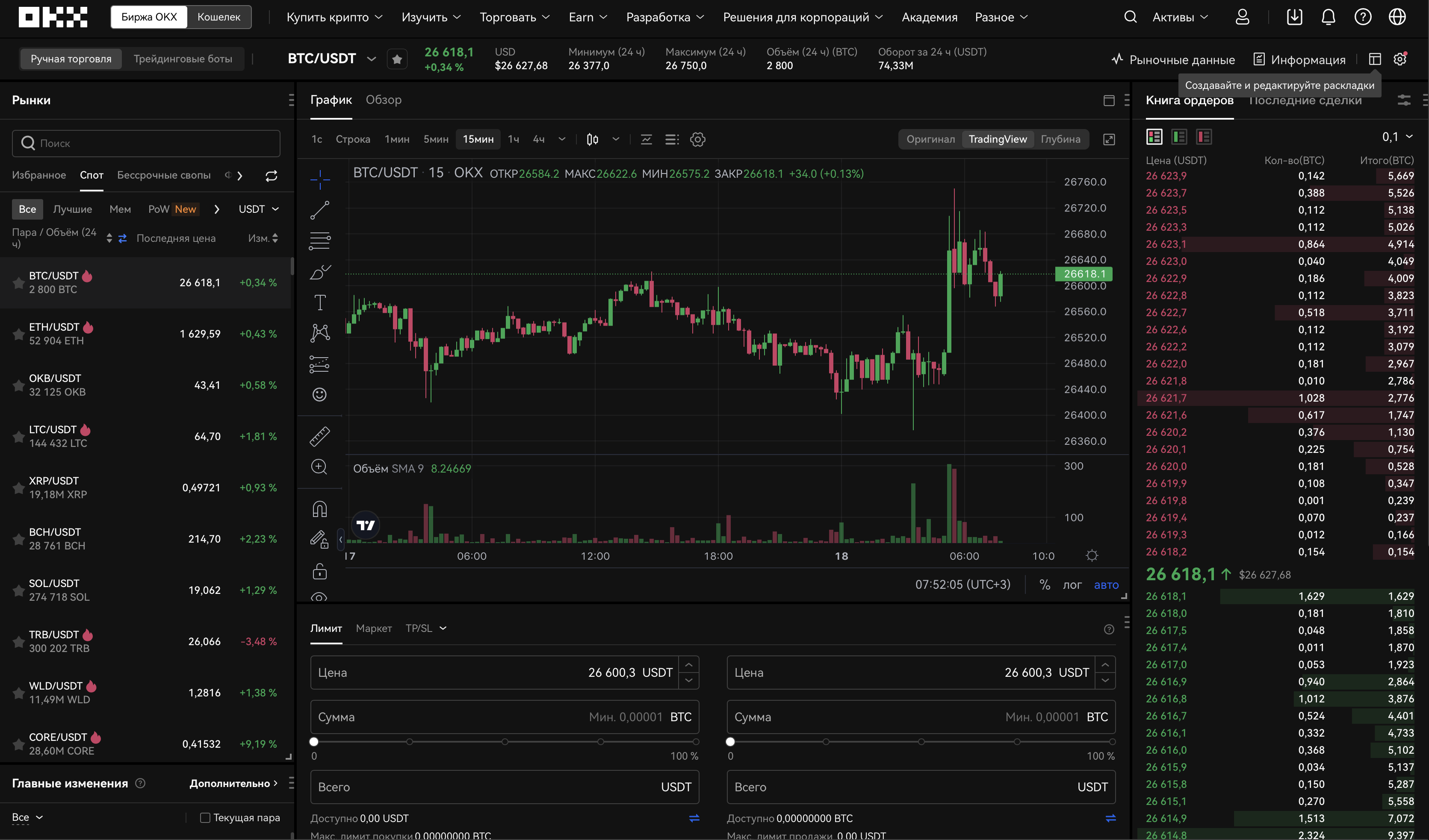 На спотовом рынке OKX трейдеры могут совершать сделки по рыночным ценам и размещать лимитные заявки. Прежде чем начать торговать, нужно перевести криптовалюту для сделки с основного счета на торговый счет в меню Активы. Выбрать торговую пару можно через строку поиска или кликом по тикеру криптовалюты в блоке слева.