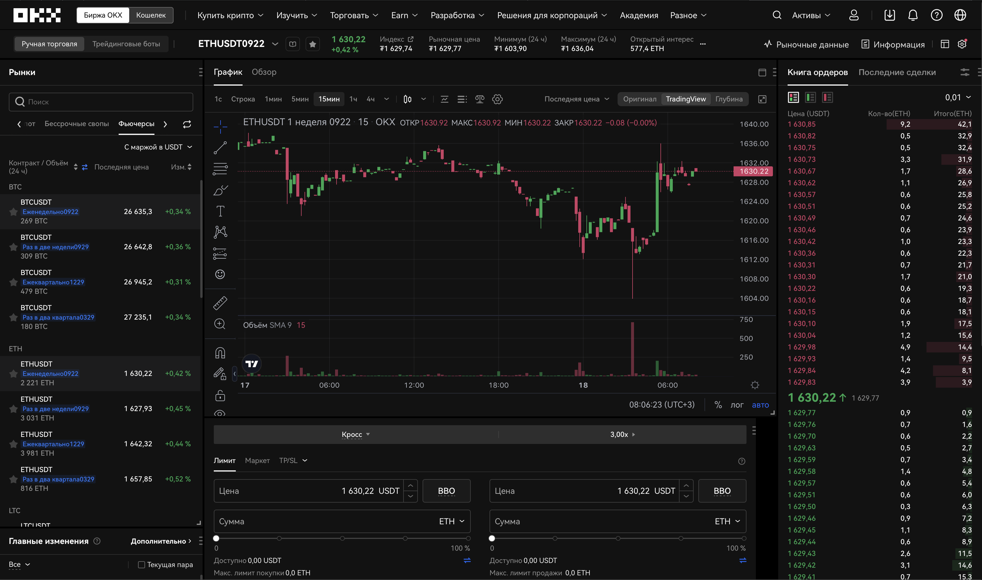 Фьючерсы на OKX размещены в разделе «Контракты и маржинальная торговля». Трейдерам доступны еженедельные, двухнедельные, квартальные и двухквартальные фьючерсы — бессрочных фьючерсов в этом разделе нет. Биржа предлагает контракты на BTC, ETH, LTC, XRP и ряд других монет, номинированные в USDT и в криптовалюте.