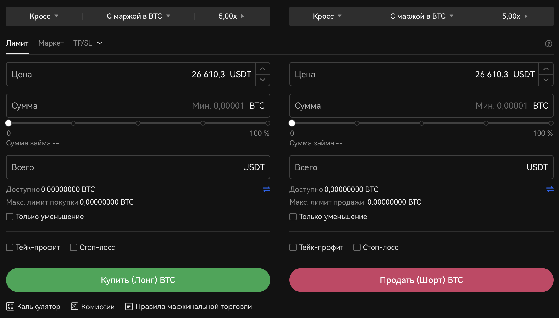 При использовании кредитного плеча трейдер предоставляет соответствующее маржинальное обеспечение — USDT или другую криптовалюту, в зависимости от выбранного типа контракта.