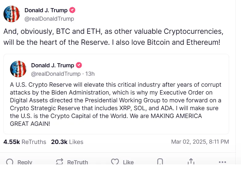 2 марта 2025 года Дональд Трамп неожиданно заявил, что в национальный криптовалютный резерв США, помимо биткоина, войдут и альткоины, такие как XRP, SOL и ADA. Ранее речь шла исключительно о BTC, что сделало его новое объявление неожиданным для рынка.