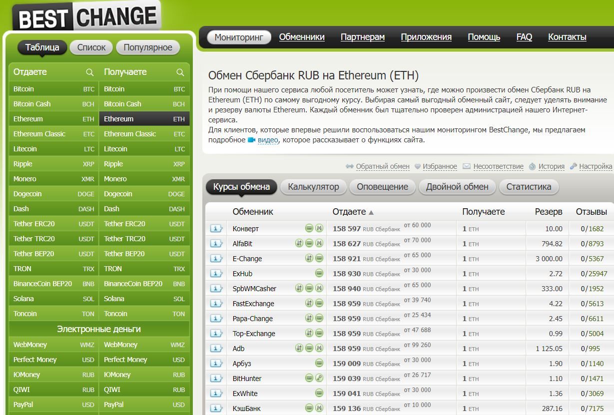 Подобрать обменник, чтобы купить Ethereum, можно, например, на агрегаторе BestChange. Для этого в разделе «отдаете» нужно указать предпочитаемый способ оплаты, например, с карты Сбербанка. В графе «получаете» следует выбрать Ethereum.