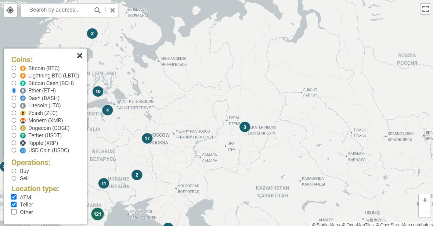 Посмотреть, есть ли в вашем городе криптомат можно, например, при помощи coinatmradar. Вот как выглядит карта криптобанкоматов в России: