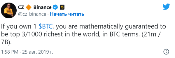 CEO популярной биржи цифровых активов Binance Чанпен Чжао уверен в том, что все владельцы хотя бы одного биткоина в будущем станут богатейшими людьми планеты. Неизбежность такого развития событий, как он считает, обеспечена техническими решениями, которые создатель биткоина – Сатоши Накамото – использовал при создании криптовалюты. Иными словами, будущее богатство владельцев биткоина, уверен Чанпен Чжао, «гарантировано математически».