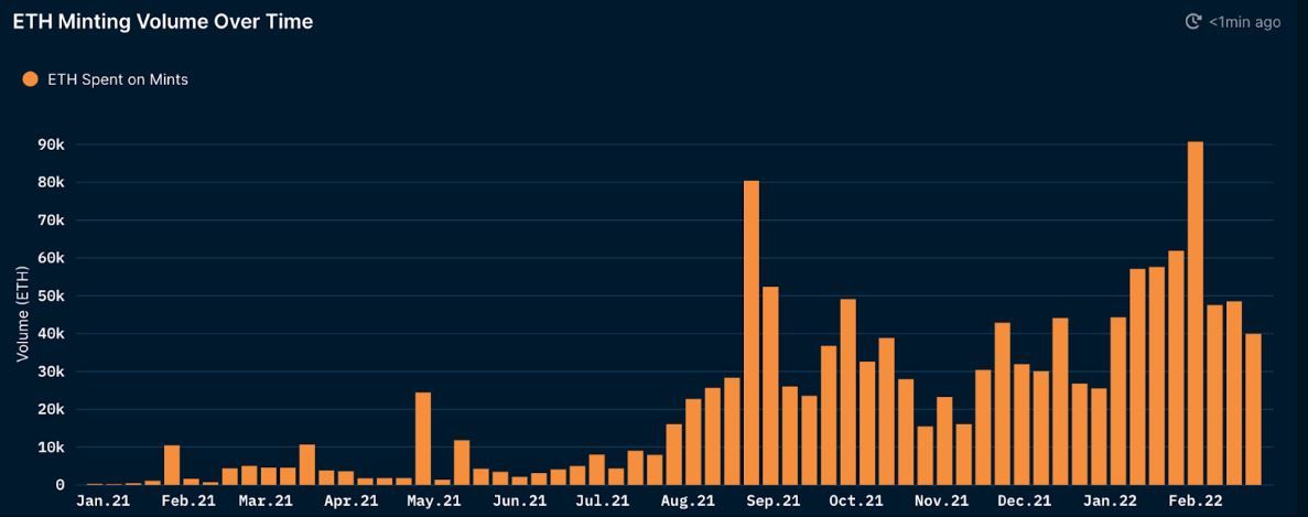 Самая популярная сеть для минтинга NFT – Ethereum. В феврале 2022 года объем использованных для чеканки невзаимозаменяемых токенов ETH достиг максимума.