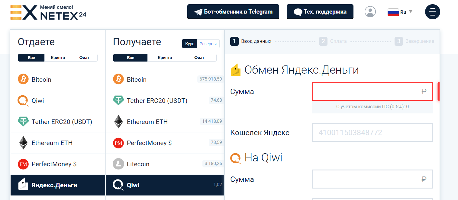 Для совершения операции помимо суммы и реквизитов платежа система также потребует указать номер телефона и адрес электронной почты. Криптообменник NetEx24 также предлагает альтернативный способ обмена – через Telegram-бот проекта. Ссылка на него доступна на главной странице сервиса.