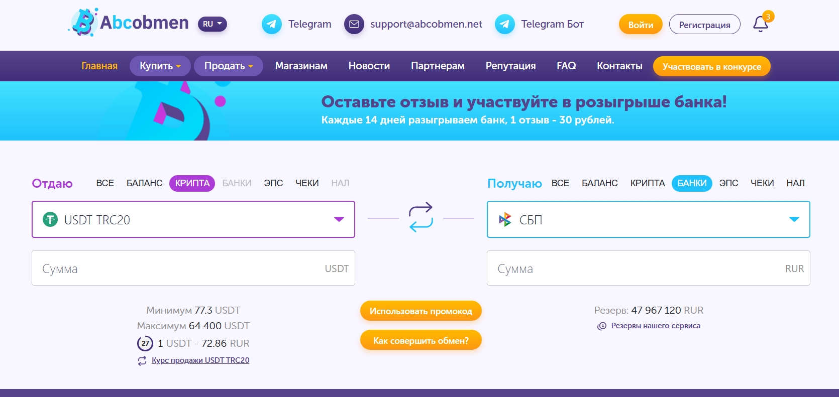Если нужен простой и быстрый обмен без лишних действий, лучше всего подойдет Abcobmen. Регистрация не обязательна, курс сразу финальный, доплачивать ничего не нужно. Заявки обрабатываются быстро, сервис работает круглосуточно и одинаково удобен как для разовых обменов, так и для постоянного использования.