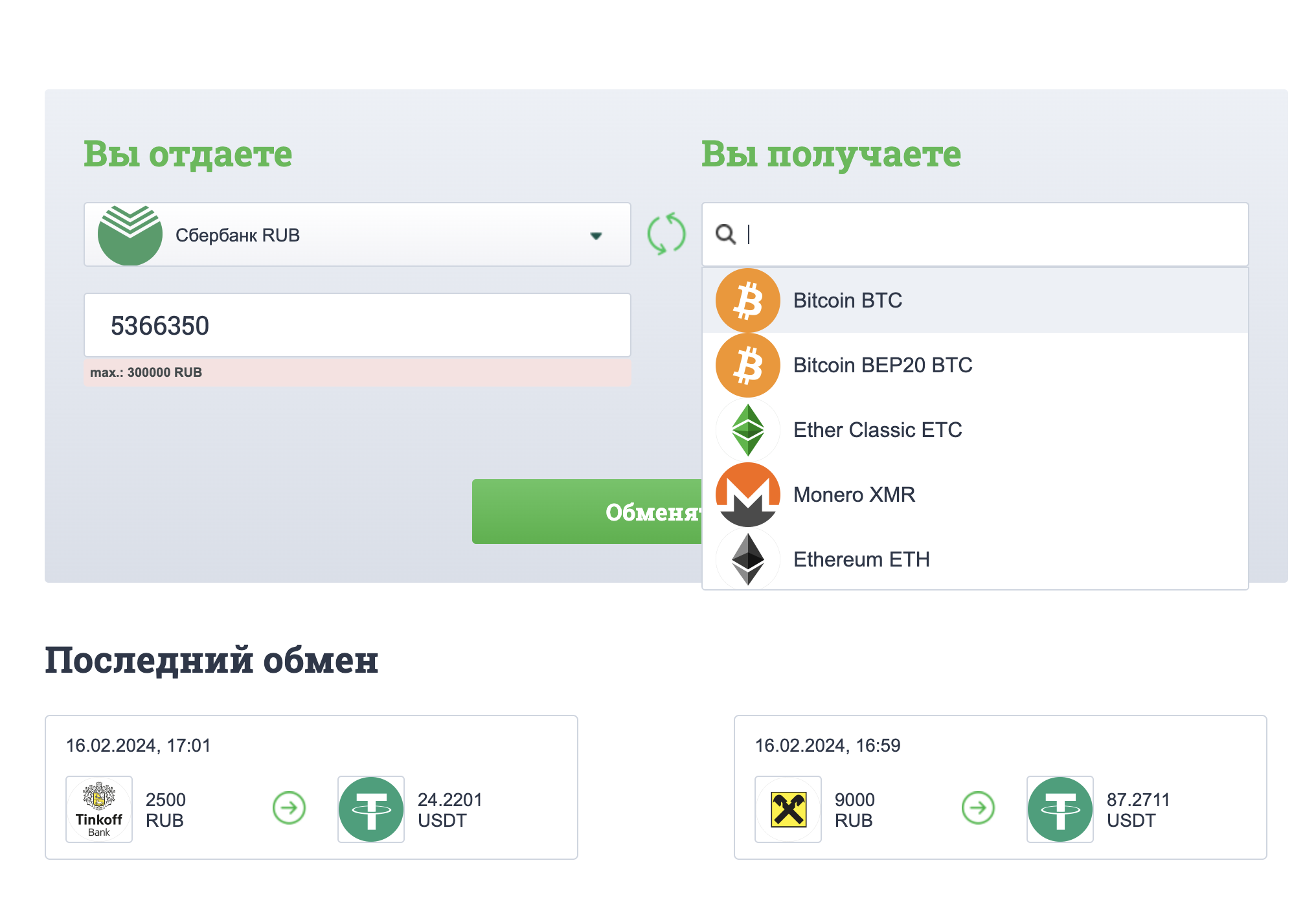 AlfaCashier поддерживает работу с криптовалютами и фиатом. На операции установлен лимит, который корректируется в зависимости от цены актива. Так, например, при стоимости биткоина $52 338, максимальная сумма обмена BTC – 0,09655005, минимальная – 0,00101711.