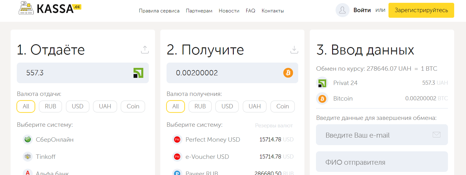 BTC обменник работает с 2017 года. Проект зарегистрирован в Нидерландах, однако основной язык платформы – русский. В Kassa представлено свыше 2000 вариантов обмена (по данным BestChange). Интерфейс проекта выглядит следующим образом:
