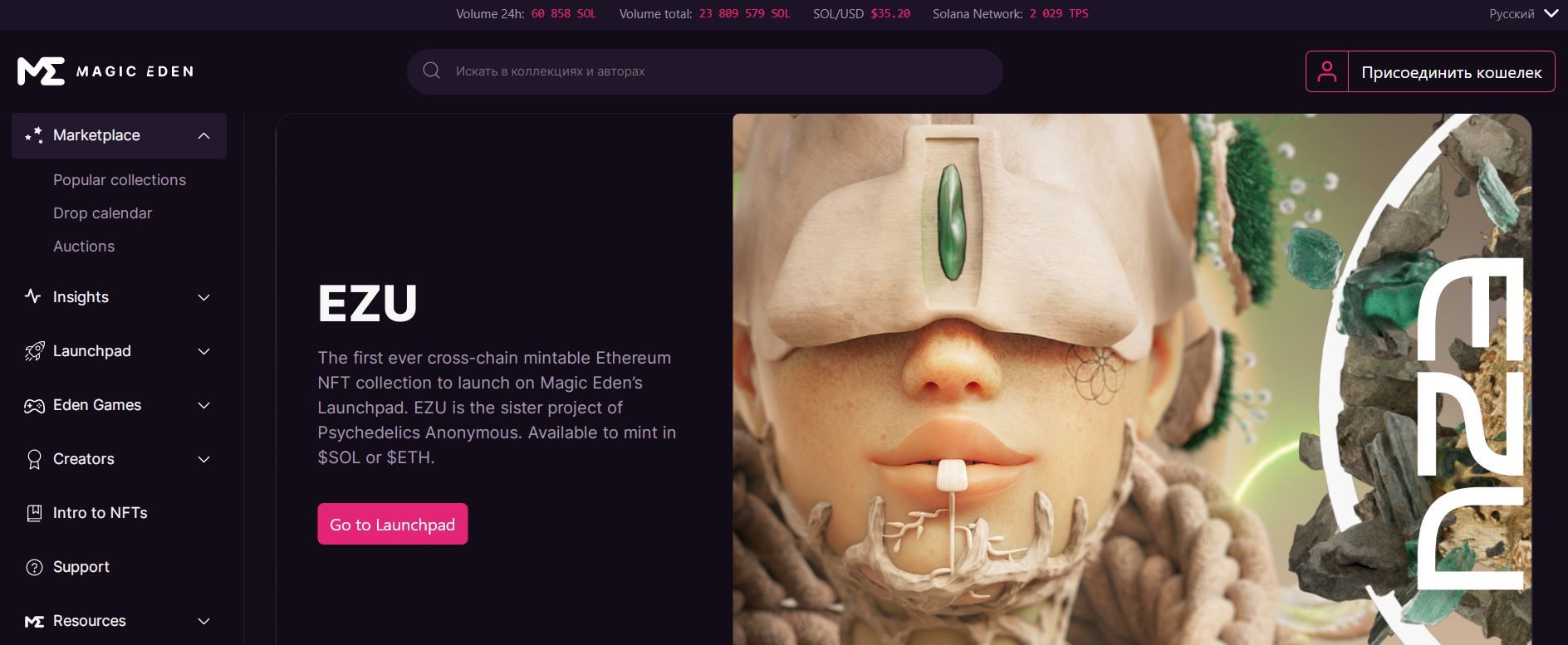 Magic Eden – это децентрализованный NFT-маркетплейс на блокчейне Solana. Платформа частично переведена на русский.