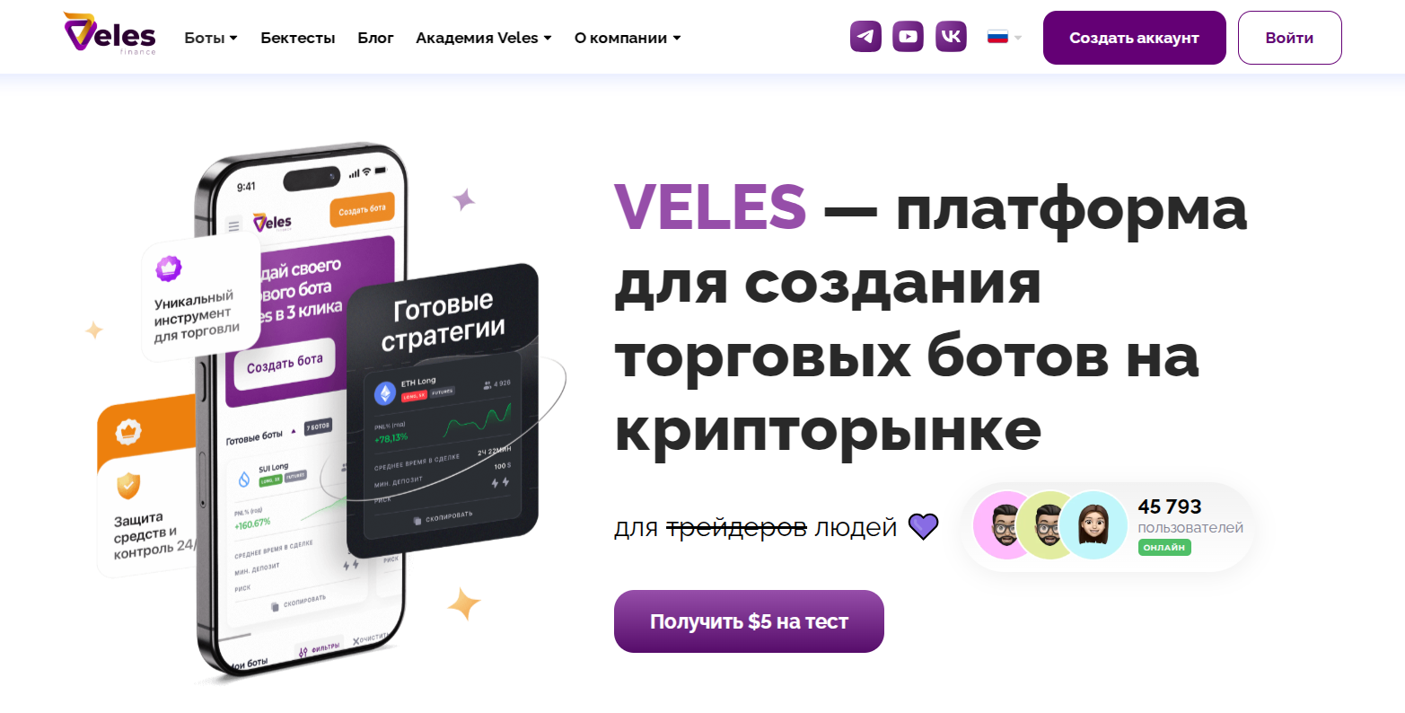 Veles позиционирует себя как удобный инструмент для тех, кто хочет использовать боты для торговли криптовалютой без углубленного изучения технической части. При этом опытные трейдеры найдут здесь продвинутые настройки и аналитику.