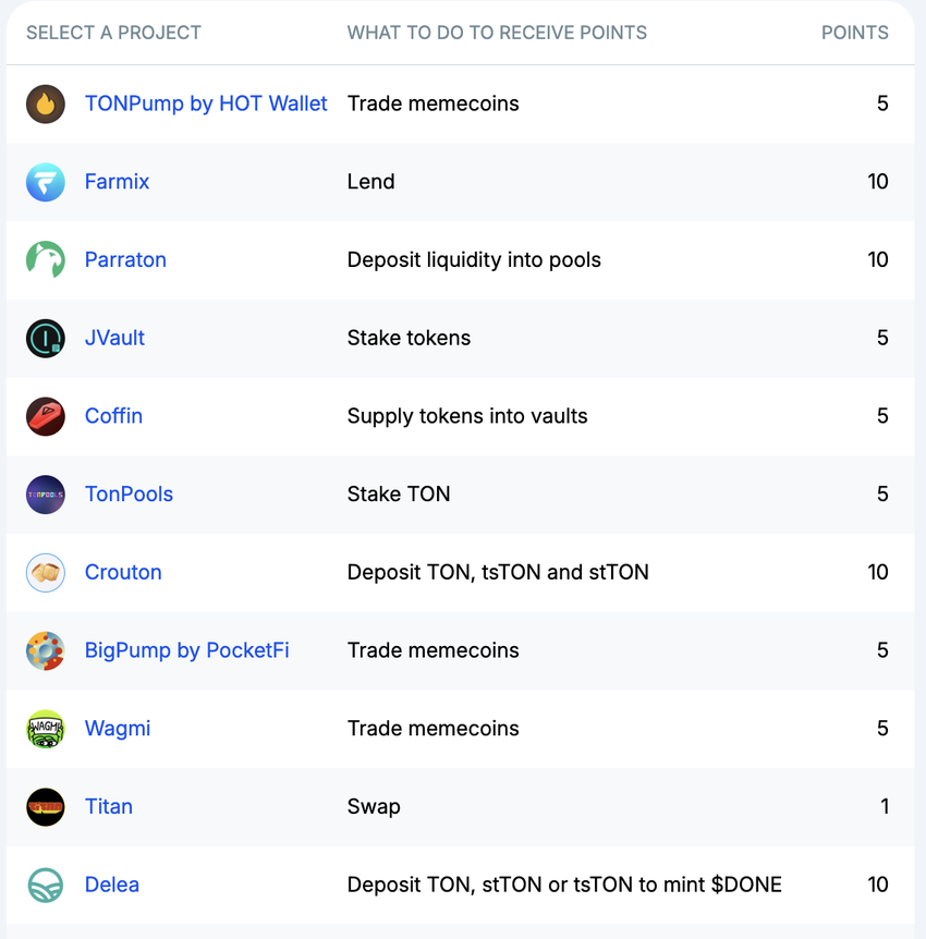 - Сосредоточьтесь на протоколах с высокими баллами: выбирайте «дорогостоящие» действия, например, стейкинг $20 в протоколе Aqua или TonStable даст 15 очков.
