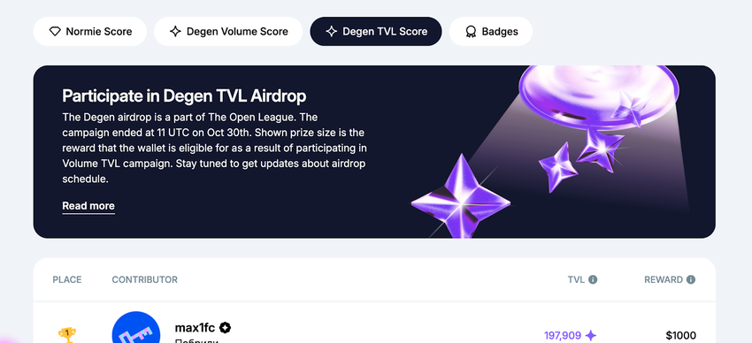 В последующих сезонах появилась лига NFT, лига приложений и лигой DeFi. Затем пришли самые популярные сезоны — аирдропы Normie и Degen, ориентированные на обычных и опытных пользователей.