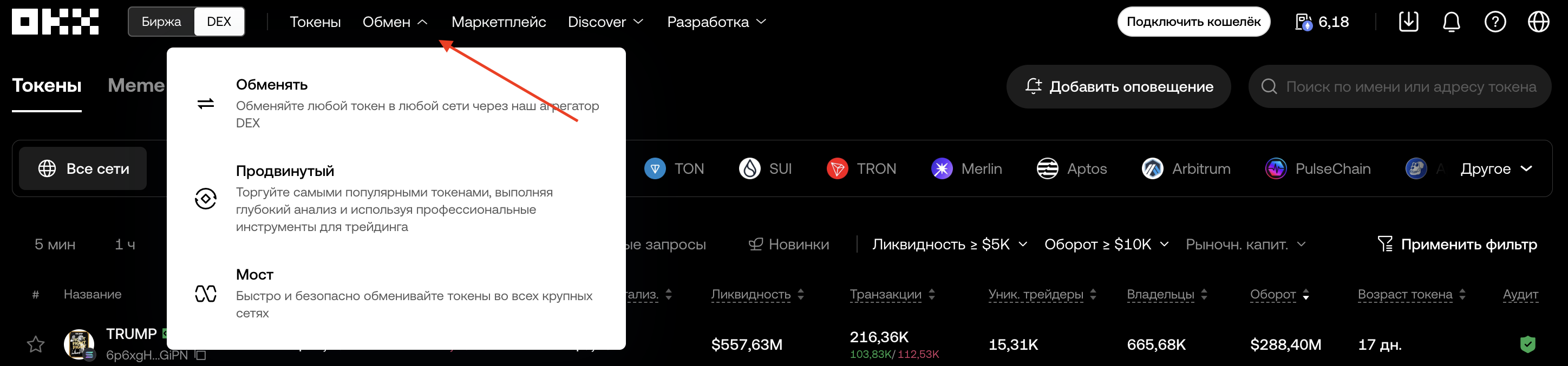 - выберите вкладку «Обмен» и затем «Рынок» для просмотра доступных токенов;