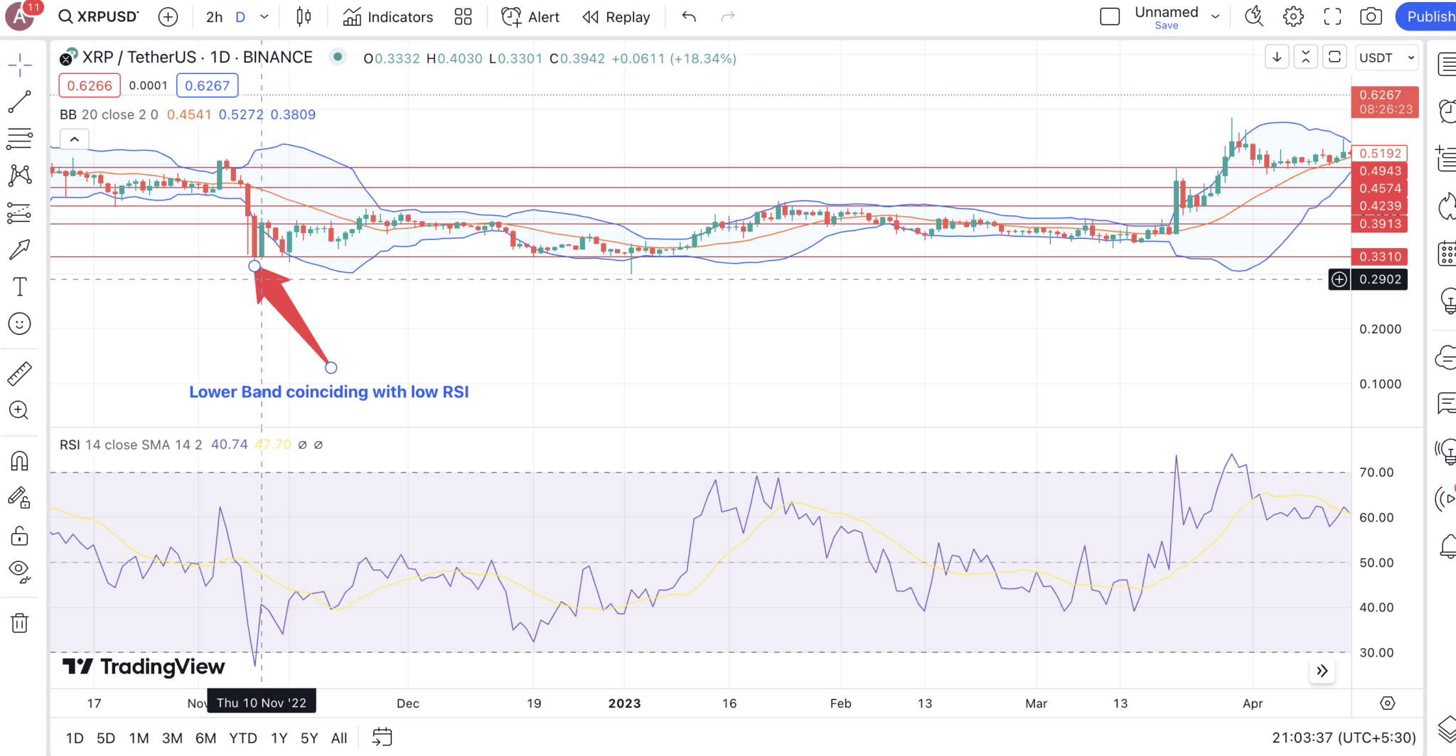 Индекс относительной силы (RSI) позволяет определить, находится ли цена в области перекупленности или перепроданности. Например, если цена только что коснулась верхней полосы, а RSI находится ниже 70, можно ожидать коррекции. Отскочивший от нижней полосы актив может оказаться в зоне перепроданности, если RSI пришел в зону между 30 и 40.