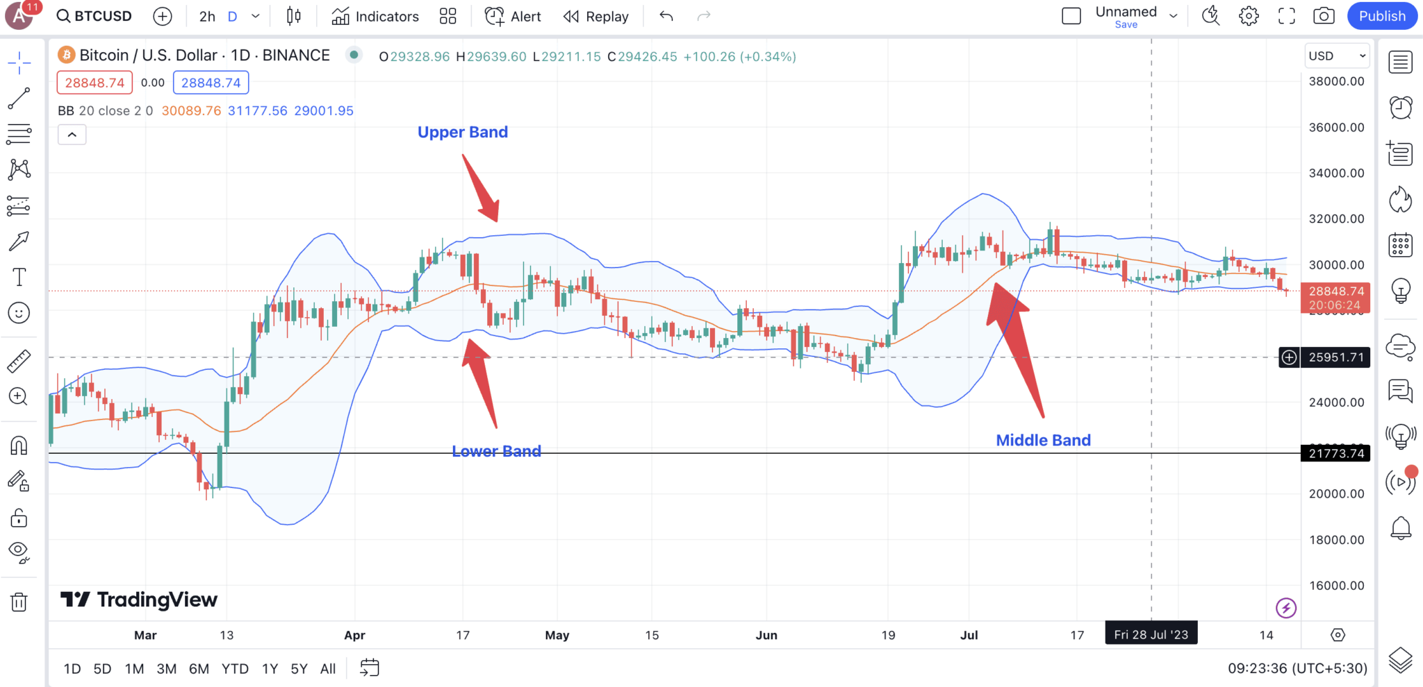 - Верхняя полоса: 20-дневная SMA + (20-дневное стандартное отклонение x2)