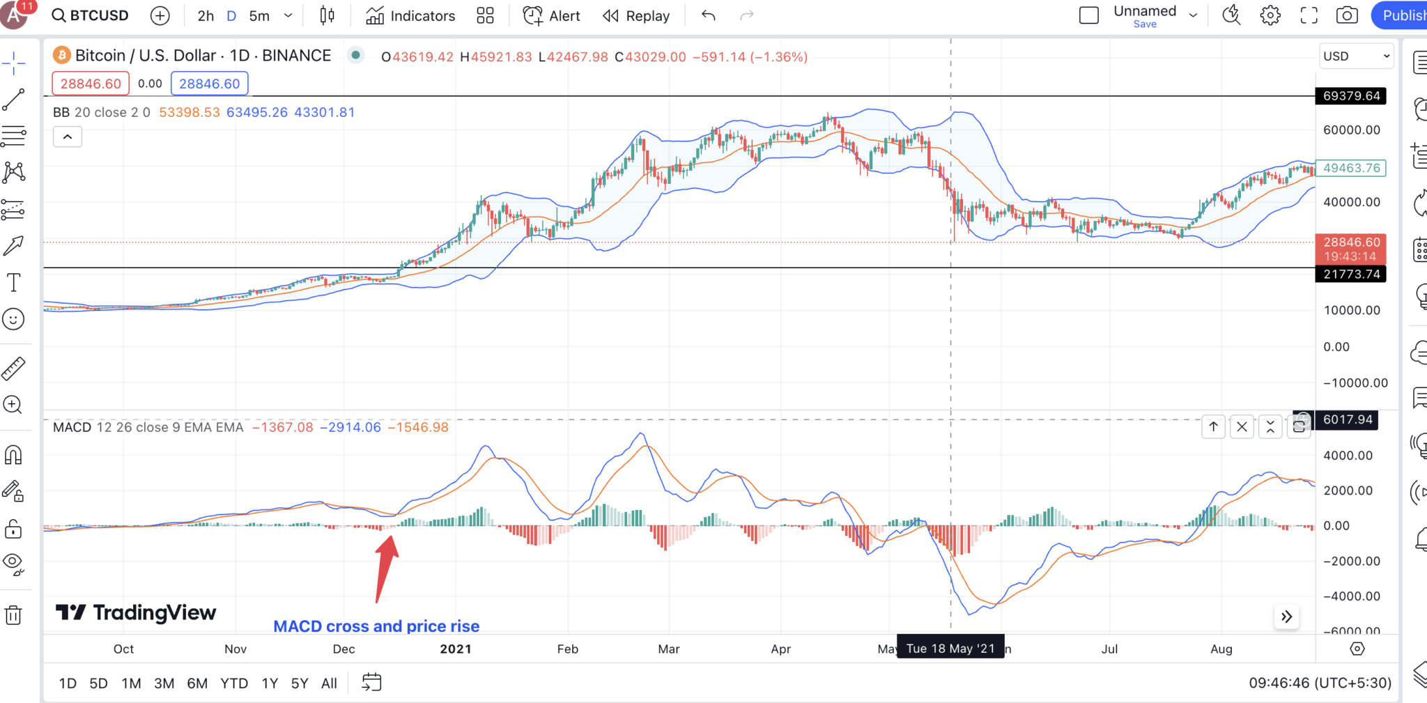 MACD помогает подтвердить сигналы, созданные полосами Боллинджера. Идея заключается в том, чтобы проверить, пересекает ли линия MACD сигнальную линию, когда происходит сжатие или когда цены движутся очень близко к нижней полосе. Это подтверждает прорыв вверх или краткосрочный скачок цен.