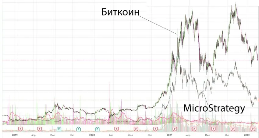 Компания начала скупать криптовалюту в августе 2020 года. На фоне интереса MicroStrategy к монете акции организации стали повторять движения биткоина.