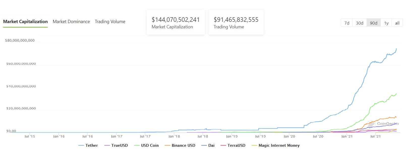 Получается, что рынок стейблкоинов, исходя из данных капитализации, находится где-то между основанной в 1850 году американской финансовой компанией American Express и открытой в 1847 году американской табачной компанией Philip Morris. Обе организации, исходя из стоимости их акций, входят в международный топ-100 капитализации. В нем American Express находится на 87 месте, а Philip Morris – на 86.