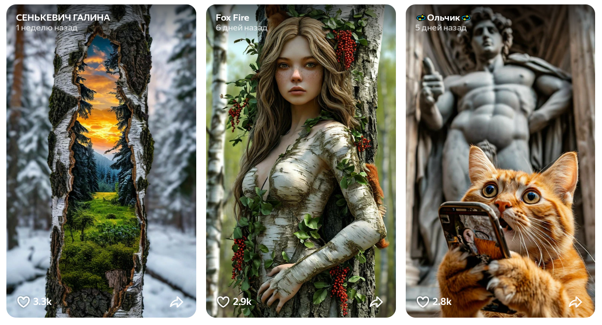 На платформе есть топы лучших работ, подборки, а также альбомы со сгенерированными изображениями. На авторов, чьи работы вам понравились, можно подписаться.