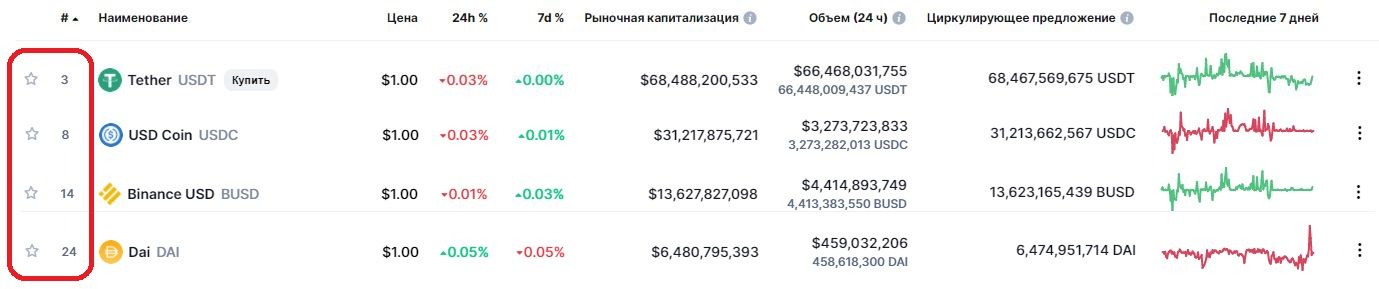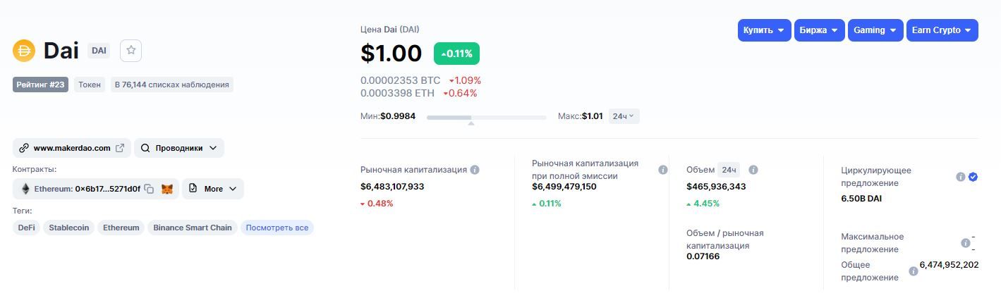 Dai — далеко не самый капитализированный стейблкоин. По состоянию на момент написания обзора, его опережают такие монеты, как Tether, USD Coin и Binance USD.