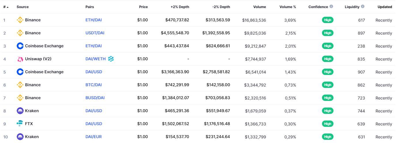 Dai криптовалюта представлена в парах со стейблкоинами, традиционными криптовалютами и фиатом на многих популярных криптобиржах.