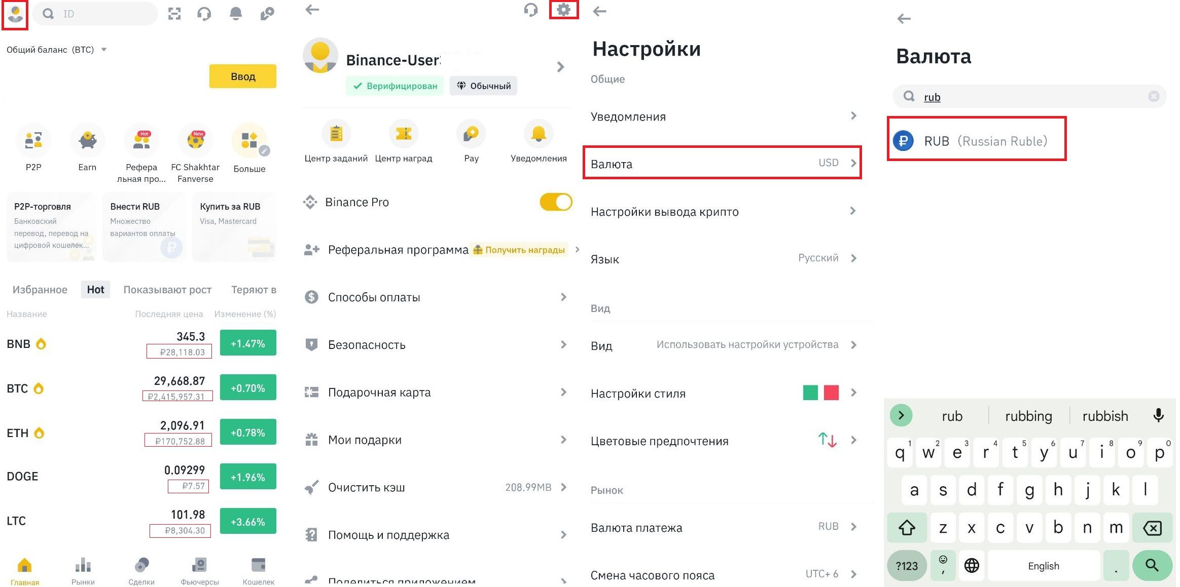 Многие криптобиржи позволяют пользователям отслеживать курс криптовалюты в рублях. Например, на Binance можно настроить одновременный вывод стоимости монет как в рублях, так и в долларах США. Для этого в настройках нужно выбрать интересующую валюту, как это показано на скрине ниже: