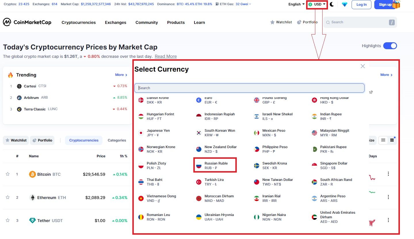 Еще отслеживать курс биткоина в рублях, а также перевести другие токены в рубли можно на популярных агрегаторах данных о рынке цифровых активов. Один из распространенных вариантов — CoinMarketCap. Чтобы платформа выводила курс криптовалют в рублях, нужно указать национальную валюту РФ в настройках, как показано на скрине ниже: